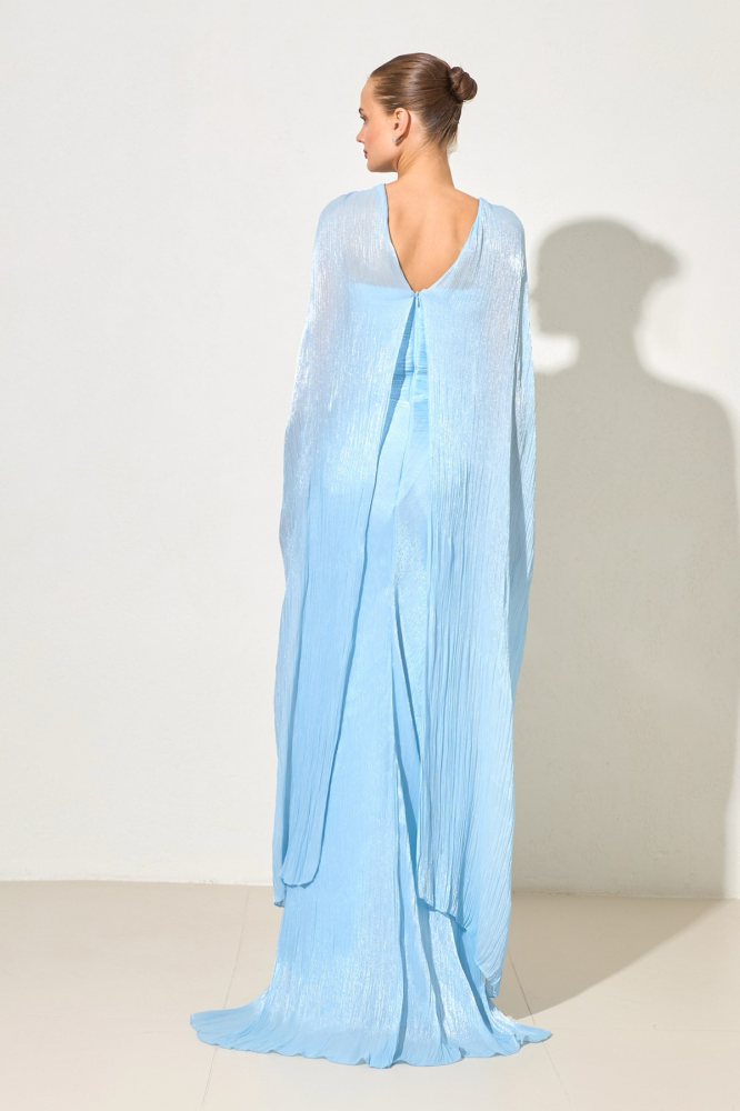 اختاري من فساتين سهرة فستان سماوي فاتح بتصميم بليسيه فاخر وكِيب أنيق لإطلالة تخطف الأنظار وتعبّر عن ذوقك الرفيع.