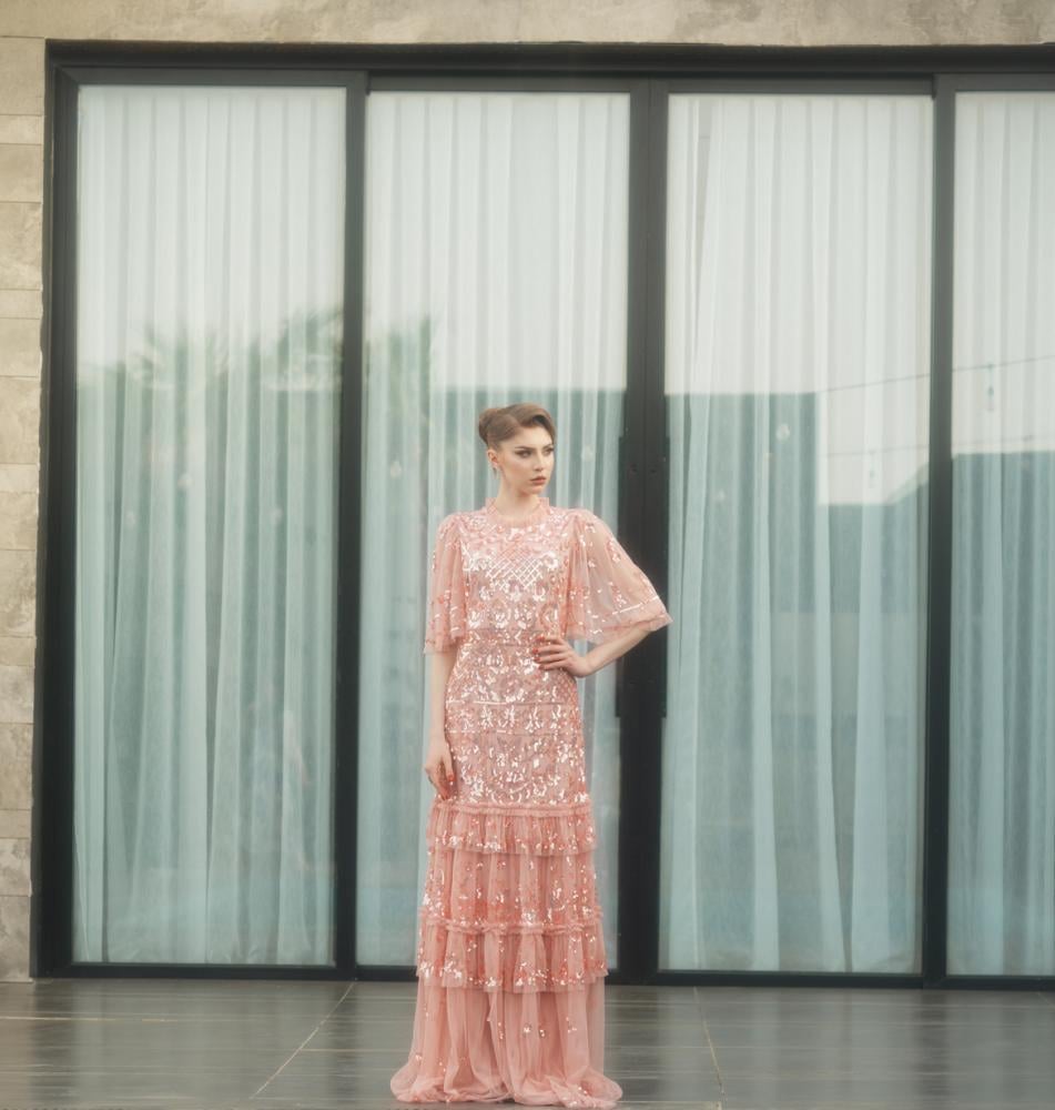 تألقي ببريق خاص مع فستان لامع طويل من التل الوردي المزخرف بشك يدوي هندي، لأناقة تنبض بالرقي والأنوثة.