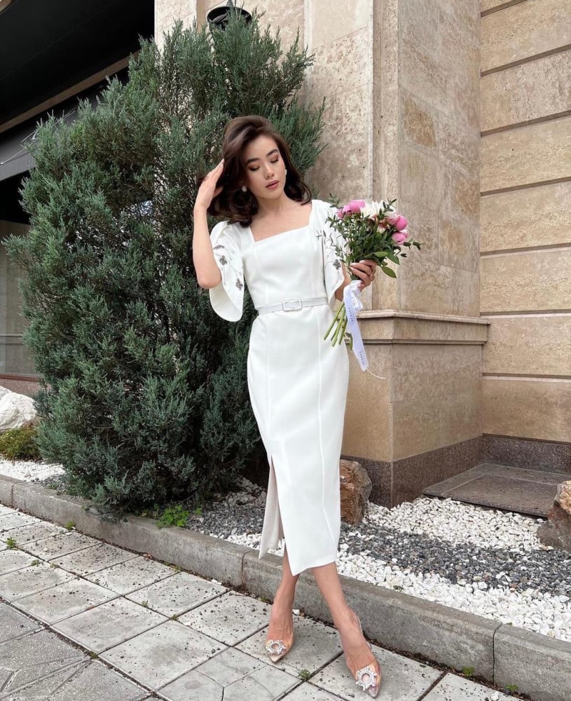- فستان ابيض ميدي تصميم أنيق يعكس الفخامة بأسلوب بسيط وراقي