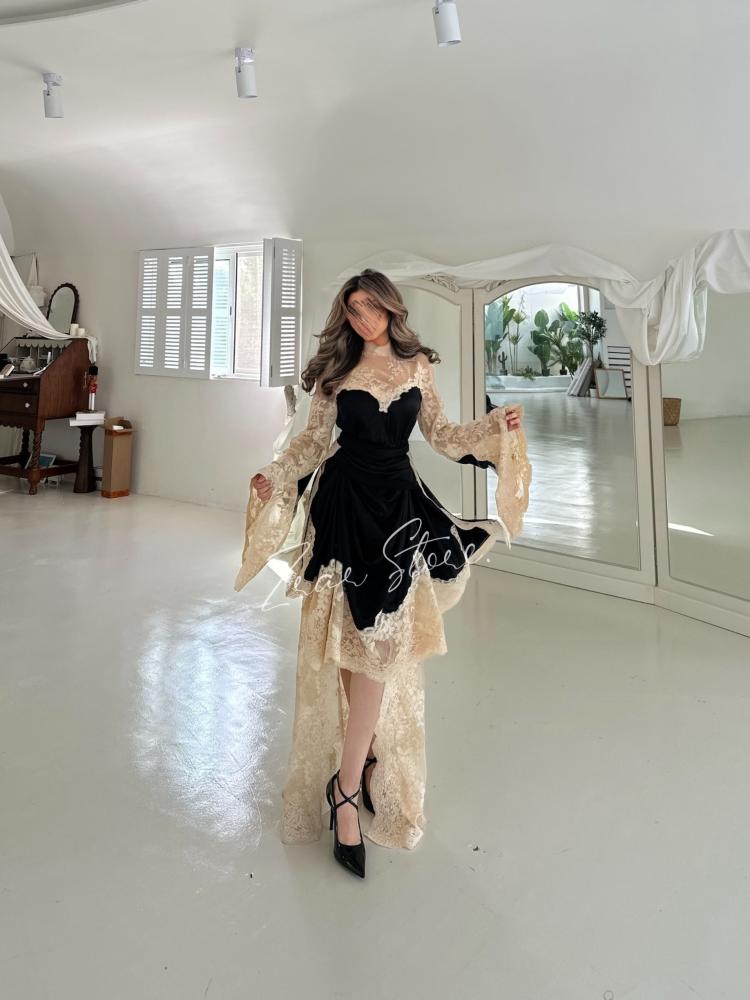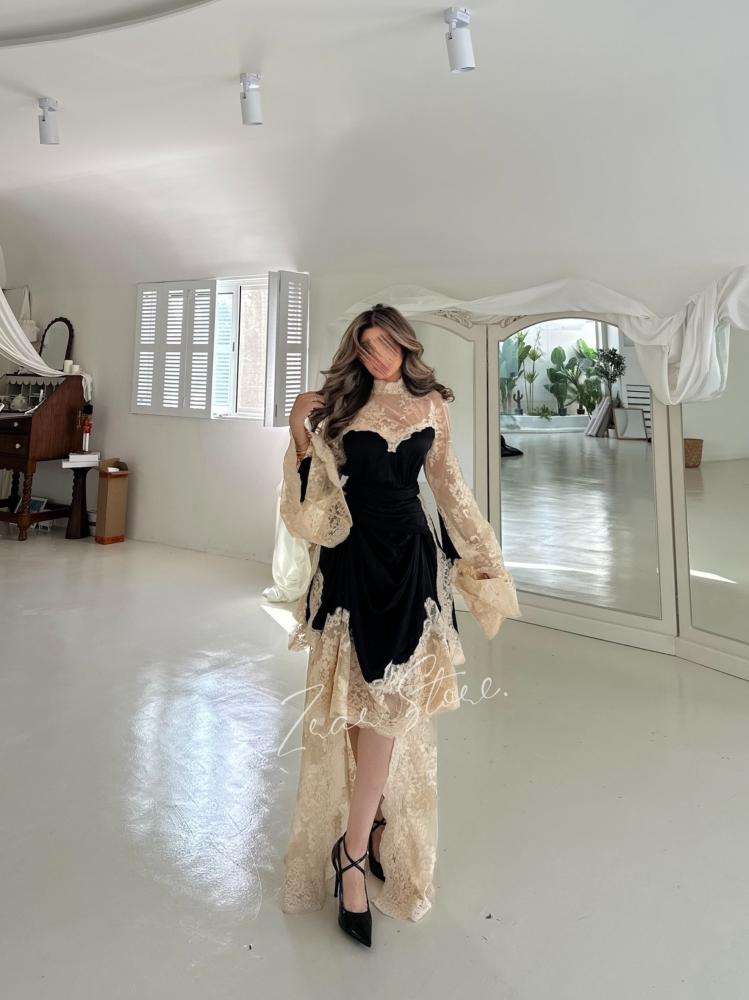 فستان اسود دانتيل قصير بيج يمنحك إطلالة أنثوية وأنيقة مثالية للسهرات والمناسبات الخاصة.