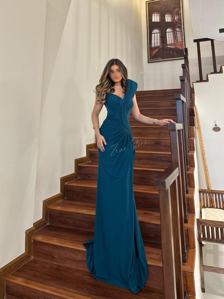 • التصميم: فستان بقصة وان شولدر (كتف واحد) مع طيات جانبية تضيف لمسة من الأناقة.