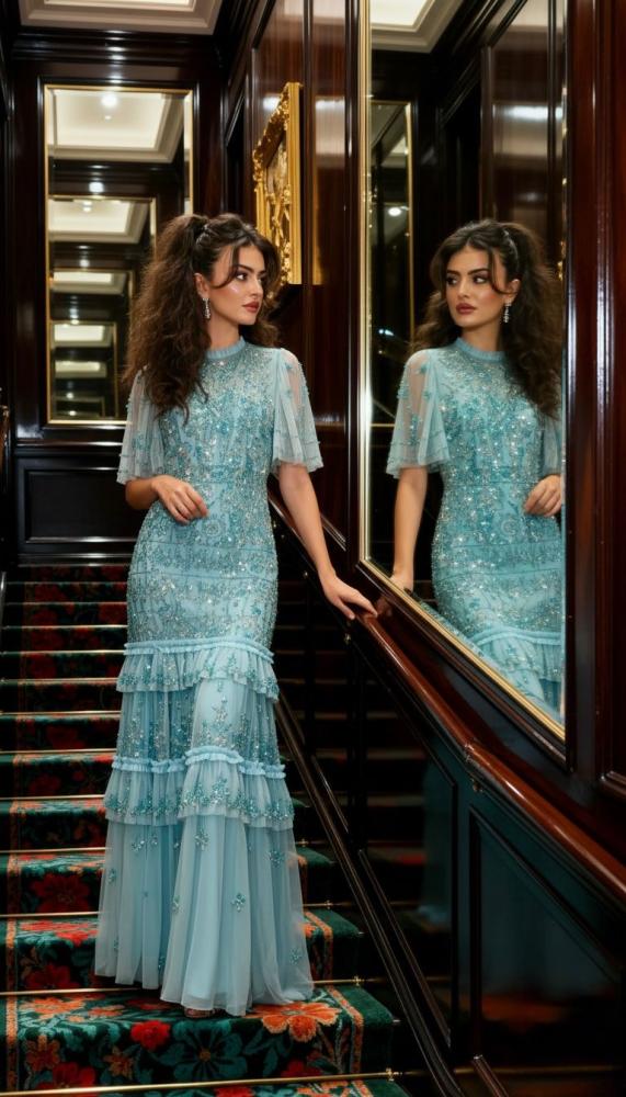 تألقي بإطلالة شرقية مبهرة مع فستان فيروزي طويل من التل السماوي المزخرف بشك يدوي هندي فاخر.