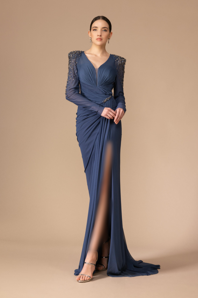 فستان كينزال مطرز تل درابيه بذيل منسدل مزين بالاحجار