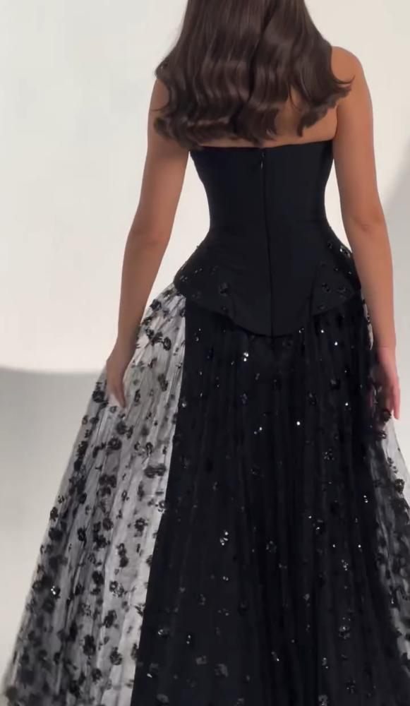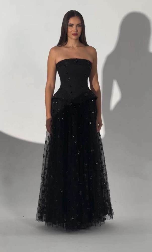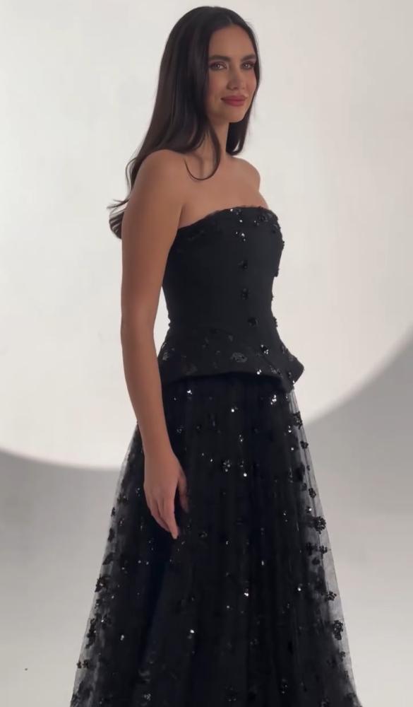 فستان سهرة اسود اوف شولدرز كريب وتل