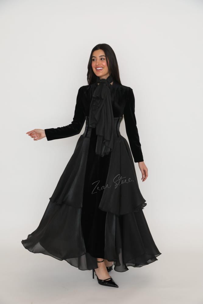 - اسم المنتج : فستان مع وشاح مخمل باطراف رفلز